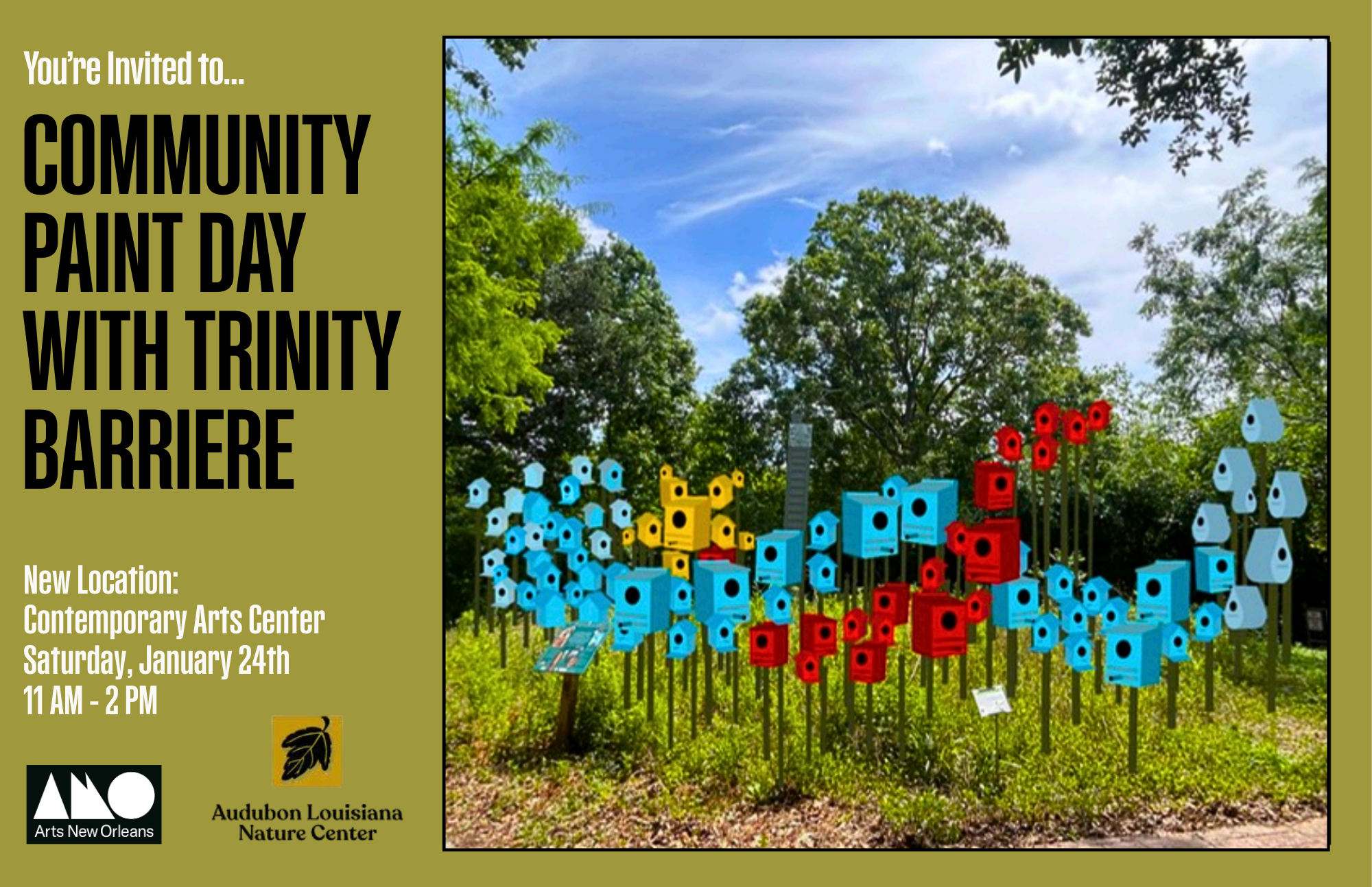 Contemporary Arts Center 900 Camp St., New Orleans, LouisianaArts New Orleans is delighted to invite you to a special Community Paint Day with artist Trinity Barriere on Saturday, January 24th, at the Audubon Louisiana Nature Center. This is a unique opportunity to contribute to The Mirage, a large-scale public art sculpture that will become a permanent installation in New Orleans East.…